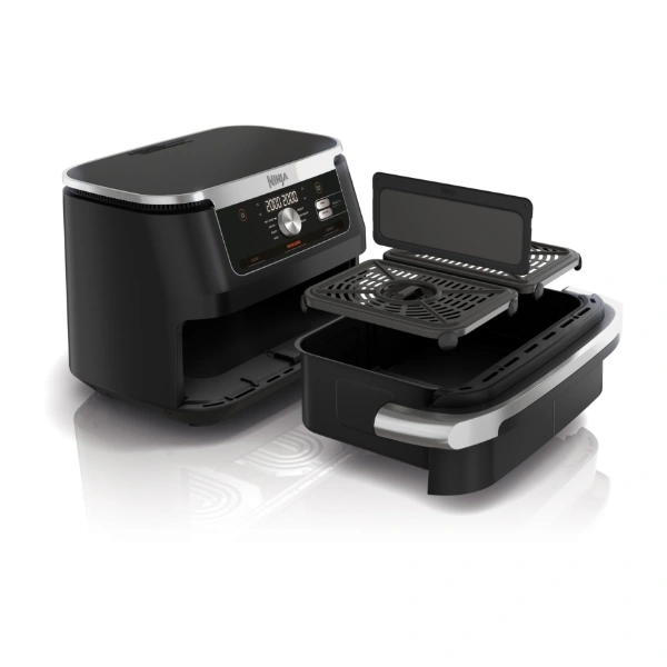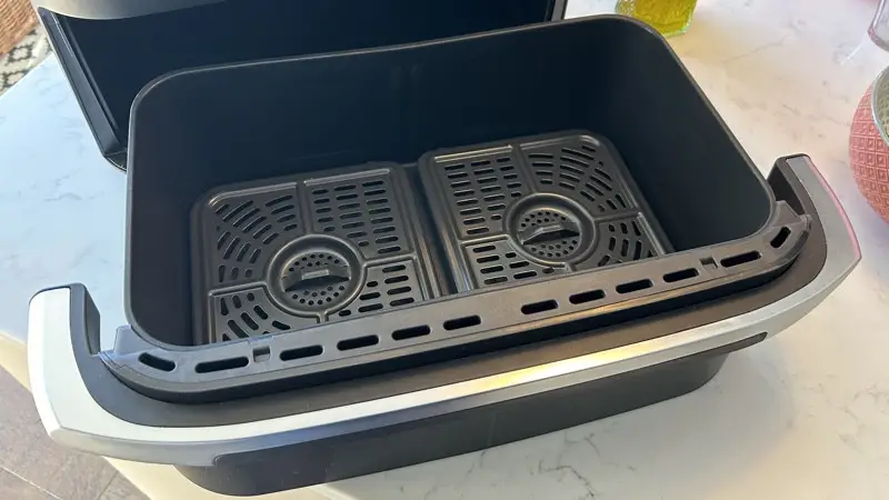 استفاده از یک مخزن عریض و یکدست 10.4 لیتری در سرخ کن نینجا af500 به معنای پخت انواع غذاها در حجم بسیار بالایی بوده که نیاز روزمره یک خانواده 8-9 نفره را به سادگی برطرف میکند. البته این مخزن به کمک یک جداکننده قابلیت تقسیم شدن را داشته تا بتوانید در هر بخش یک برنامه غذایی متفاوت را اجرا کنید. مانند دیگر هواپز های دوقلو نینجا، شما میتوانید تنها از یک مخزن استفاده کنید و دیگری را در حالت خاموش نگه دارید. نوع سبد این مخزن به شکل سینی بوده که در قسمت کف مخزن سرخ کن دوقلو قرار میگیرند. دو عدد سینی در یک سایز که از جنس پوشش سرامیکی نچسب طراحی شده و از چسبیدن مواد غذایی جلوگیری میکند.