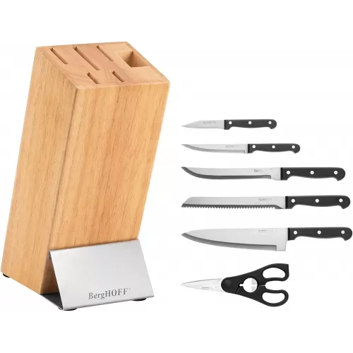 کمپانی بلژیکی برگهف برندی بین المللی است با 20 سال تجربه در زمینه طراحی و تولید محصولات پیشرفته آشپزخانه. شرکت برگهف همواره در زمینه طراحی به روز و چشم نواز محصولات آشپزخانه با در نظر گرفتن کوچکترین جزئیات پیشرو بوده و توانسته تحسین بسیاری از کارشناسان امر و سرآشپزان بین المللی را برانگیزد. ست چاقوی آشپزخانه 7 پارچه برگهف مدل ESSENTIALS QUADRA از یک بلوک چوبی، 5 چاقو و یک قیچی با کیفیت بالا از جنس استیل ضد زنگ ساخته شده است. دسته چاقو ها از طراحی ارگونومیک خوبی بهره برده اند و به خوبی در دست جای میگیرند. همچنین تیغه چاقو ها از جنس فولاد ضد زنگ با عمر بالا ساخته شده است.