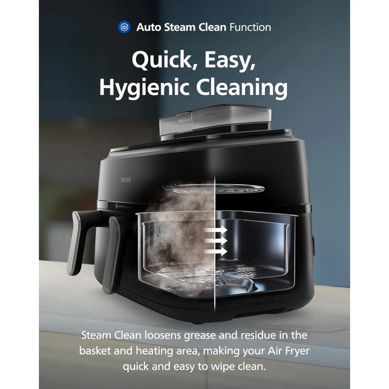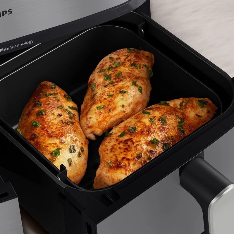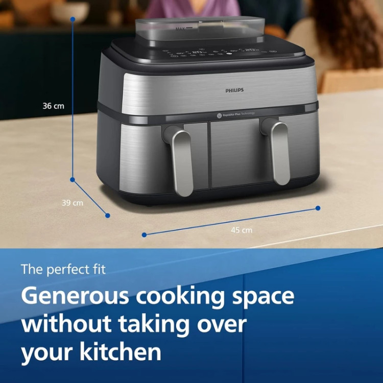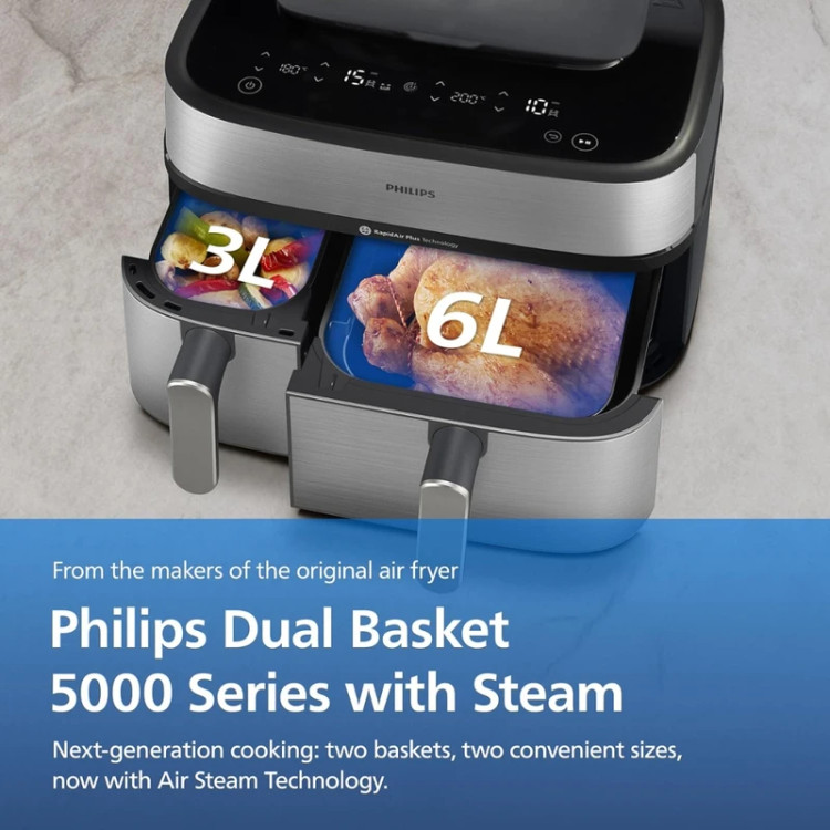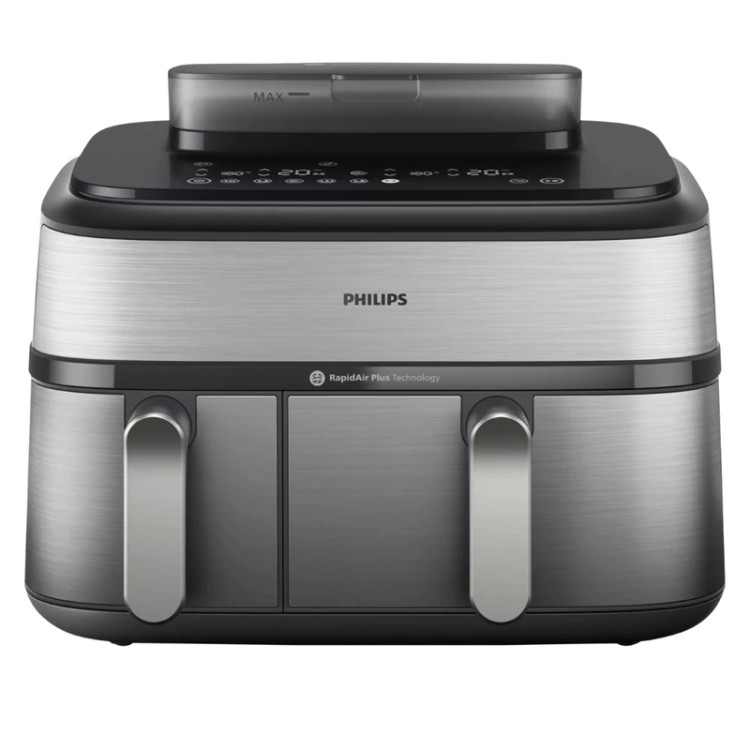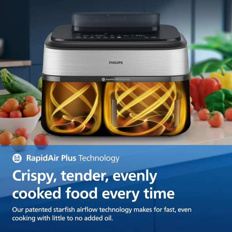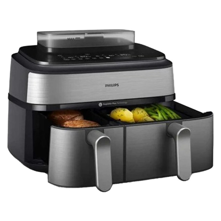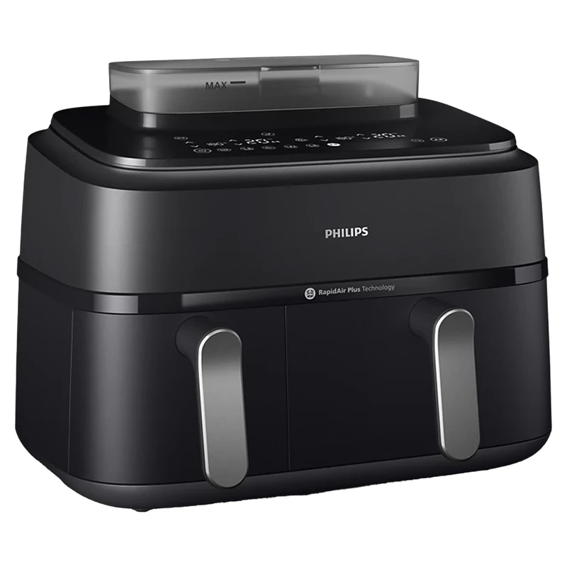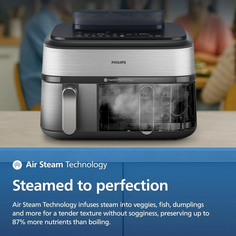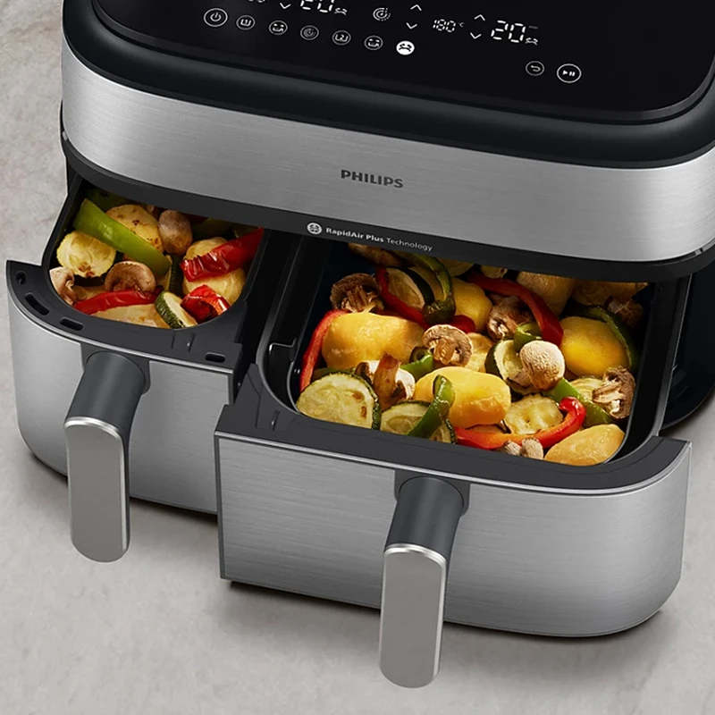یکی از نقاط قوت اصلی این مدل، فناوری اختصاصی فیلیپس یعنی RapidAir Plus است که جریان هوای داغ را با سرعت بالا و زاویه چرخشی در اطراف مواد غذایی حرکت میدهد. نتیجه این فرایند، پخت یکنواخت و کاهش محسوس مصرف روغن است. RapidAir Plus باعث میشود مواد غذایی بدون اینکه نیاز به پشتوروکردن مداوم داشته باشند، سطحی کاملاً برشته و مغزی پخته پیدا کنند. در کنار این فناوری، قابلیت Air Steam نیز ارائه شده است که امکان پخت همراه با بخار را فراهم میکند. این ویژگی مخصوصاً برای مرغ، سبزیجات، ماهی و غذاهای بخارپز اصیل اهمیت دارد. بخار باعث حفظ رطوبت داخلی غذا شده و از خشکشدن غذا جلوگیری میکند؛ موضوعی که معمولاً در سرخکنهای بدون روغن مشاهده میشود. ترکیب این دو فناوری دستگاه را به گزینهای ایدهآل برای غذاهای ترکیبی مانند مرغ بخارپز-گریل، نان نرم با روی برشته یا سبزیجات بخارپز شده با لایه کاراملی تبدیل کرده است. از مزایای مهم NA555/09، تنظیم جداگانه دما و زمان برای هر یک از محفظهها است. این سیستم امکان پخت همزمان دو غذا را فراهم میکند؛ برای مثال میتوانید در سبد ۶ لیتری مرغ را با دمای ۱۸۰°C و در سبد ۳ لیتری سیبزمینی را با دمای ۲۰۰°C آماده کنید. این قابلیت نهتنها زمان آشپزی را کاهش میدهد بلکه انعطاف زیادی برای برنامهریزی غذایی ایجاد میکند. محفظه ۳ لیتری همچنین قابلیت بخارپز دارد و این موضوع تنوع بیشتری در کاربرد دستگاه به وجود آورده است.