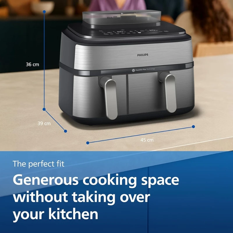 هواپز فیلیپس مدل NA555/09 با ابعاد ۳۸.۲۵x۴۴.۳۹x۳۵.۱۷ سانتیمتر و وزن ۸.۸ کیلوگرم محصولی نسبتاً بزرگ محسوب میشود که برای استفاده روی کانتر آشپزخانه نیاز به فضایی مخشص دارد. طراحی دستگاه ترکیبی از خطوط مدرن و حجم متعادل است و کیفیت ساخت بالا در بدنه پلاستیکی مقاوم به حرارت کاملاً مشهود است. یکی از ویژگیهای مهم این مدل، داشتن دو محفظه مجزا است؛ یک سبد ۶ لیتری و یک سبد ۳ لیتری که مجموع ظرفیت ۹ لیتر را تشکیل میدهند. این ظرفیت برای ۹ نفر مناسب است و میتواند غذای یک خانواده پرجمعیت را بدون نیاز به چند مرحله پخت آماده کند. طراحی دو محفظه باعث میشود دو نوع غذای متفاوت، در دو دما و زمان مختلف، بهطور همزمان پخته شوند. این ویژگی یکی از مزایای بزرگ NA555/09 نسبت به مدلهای تکمحفظه است. قدرت دستگاه با توان ۲۷۵۰ وات یکی از بالاترین ارقام میان هواپزهای خانگی است و این توان بالا نقش مهمی در سرعت گرمشدن، یکنواختی جریان هوا و کیفیت نهایی پخت دارد. محدوده دمای کاری دستگاه از ۴۰°C تا ۲۰۰°C است؛ بازهای کامل که امکان انجام پختهای کمحرارت مانند خشککردن میوه، گرمکردن غذا، پخت ملایم مرغ یا بخارپز را در کنار سرخکردن با دمای بالا فراهم میکند. وجود توان بالا در کنار دمای ۲۰۰°C باعث میشود مواد غذایی مانند سیبزمینی، مرغ سوخاری یا ماهی، در مدت کمتر و با سطح خارجی طلاییتر و تردتر آماده شوند.