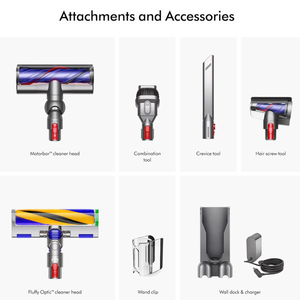 Anti-tangle hair screw tool, Combination tool, Docking station, Wand clip, Wand, Fluffy Optic cleaner head, Charger, Crevice tool, Dyson V12 Detect Slim Cordless Vacuum Cleaner, De-tangling Motorbar cleaner head