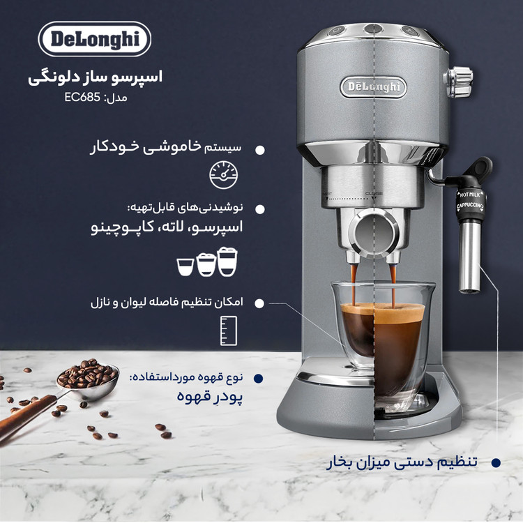 اسپرسو ساز دلونگی مدل EC685پرفروشترین اسپرسوساز برند محبوب دلونگی که بواسطهی زیبایی و جنس خوب بدنه برندی پذیرفتهشده در بین ایرانیان به حساب میآید. این قهوهساز خانگی با طراحی شکیل زیبایی آشپزخانهی شما را تضمین میکند. ابعاد کوچک 35x17x35، وزن 5 کیلوگرمی و جنس بدنه استیل با عمر بالا عامل اصلی محبوبیت این دستگاه دلونگی است. Delonghi ec685 دارای مخرن آب 1.1 لیتری در بخش پشتی است که برای تهیه چندین فنجان قهوه کافی میباشد. توان مصرفی اسپرسوساز دلونگی 1350 وات بوده و فشار بخار در این دستگاه 15 بار است که عدد قابل توجهی برای دستگاه خانگی محسوب میشود . شما علاوه بر اسپرسو میتوانید با کمک بازوی استخراج قهوه و بخار، به راحتی قهوه خود را با کرم صاف و نرمی بدست اورید همچنین لاته، کاپوچینو و آب جوش با این قهوه ساز تهیه کنید. در قسمت زیرین دستگاه سینه چکه گیر وجود دارد که هنگام ریزش مایع، قهوه یا آب، داخل این مخزن ریخته و از کثیف شدن کابینت یا میز شما جلوگیری میکند. این دستگاه دارای پنل گرمکننده در قسمت بالایی، صفحه نمایش LCD و حالت خاموشی خودکار است.